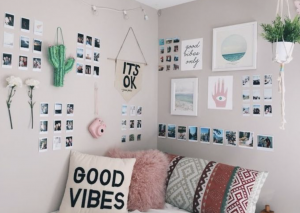 - Crea tu propia pared inspiradora: para esta opción tienes dos alternativas. La primera, imprime muchas fotos de internet y crea una pared de collage o con cartón, papeles de colores o alambre puedes colgar una frase inspiradora. ¿Quién no se levantaría de buen humor leyéndola cada mañana?