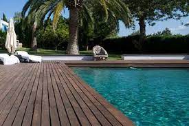 Al elegir madera para el suelo del alrededor de nuestra piscina, deberemos asegurarnos de que  este instalada con cierta inclinación hacia los desagües y con una separación mínima entra tablas para permitir la dilatación.